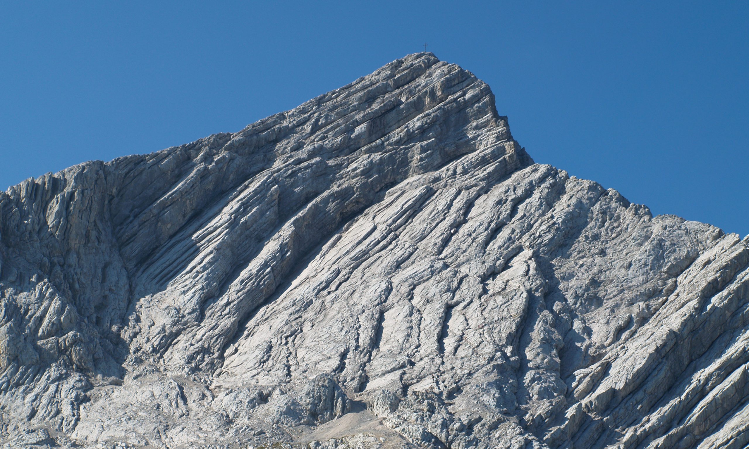 Wer ihr ganz nahekommen möchte, muss schwindelfrei sein, einen Steinschlaghelm aufsetzen und zu Karabinern und Gurt greifen: Seit 1978 führt mit der Alpspitz-Ferrata ein wahrer „Klettersteig-Klassiker“ durch die Nordwand zum Gipfelkreuz empor. Man hat mit Stahlseilen, Leitern und Metalltritten nicht gespart, um die spannendste Route über die charakteristisch schrägen Felsplatten neben den steil nach oben geschwungenen Bändern abzusichern. Wer sich dort hinaufwagt erlebt nicht nur den Reiz der Vertikalen und einen fantastischen Blick über den Garmischer Talboden, sondern wohl auch die maximale Distanz zum Bildungsraum jener Meeressedimente, in denen all die Haken stecken, denen man sich hier anvertraut.