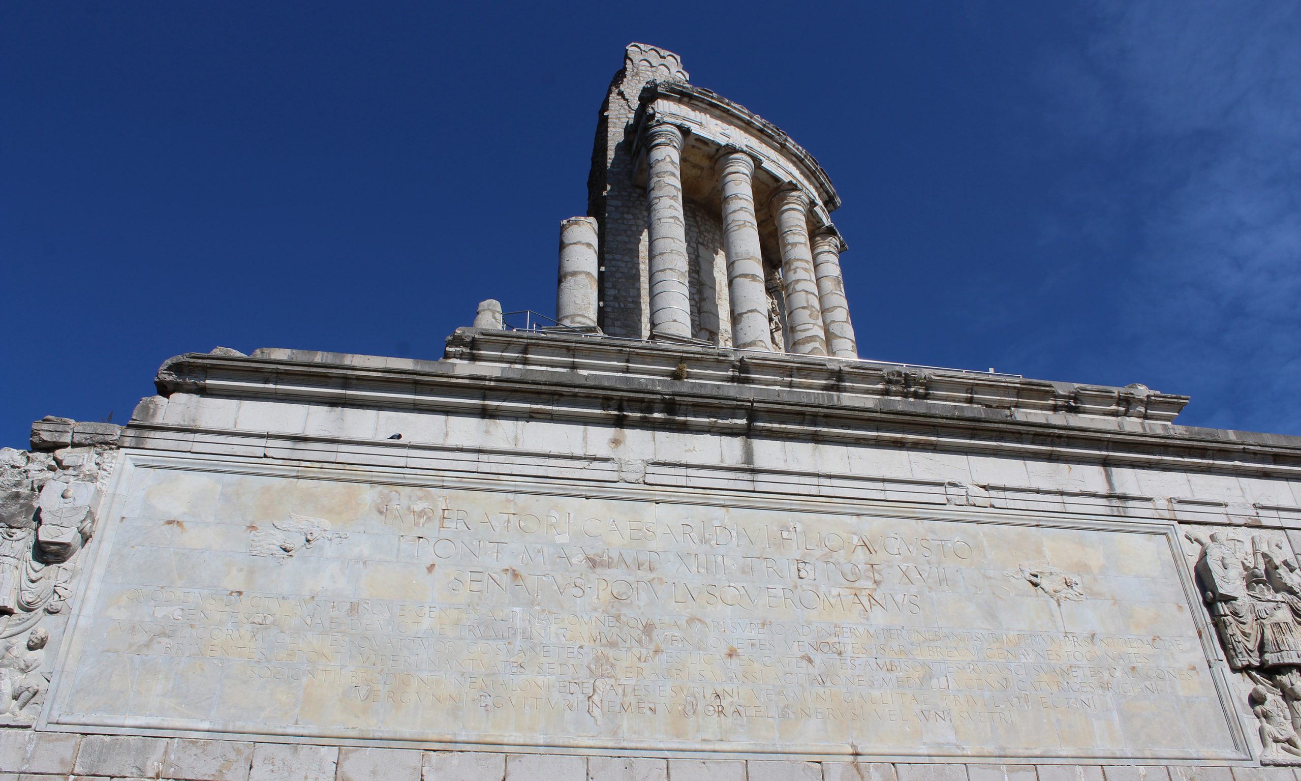 Errichtet wurde das höchst eindrucksvolle, von einer Kuppel gekrönte Monument in den Jahren 7 und 6 v. Chr. zu Ehren von Augustus (27 v. Chr. – 14 n. Chr.), dem ersten römischen Kaiser. Es verfiel zwar nach dem Ende der römischen Herrschaft, blieb jedoch in seinen Grundzügen erhalten, weil man es bis ins 18. Jahrhundert als Festung nutzte. So konnte der Architekt Jean Camille Formigé das Bauwerk im frühen 20. Jahrhundert mit den übrig gebliebenen Originalsteinen und vier erhaltenen Säulen so weit rekonstruieren lassen, dass seine ursprüngliche Struktur wieder nachvollziehbar wurde. Die riesige Steintafel, auf der die Namen der unterworfenen Alpenstämme eingraviert waren, ist zwar verloren gegangen, doch dank einer Abschrift durch Plinius den Älteren konnte sie nachvollzogen und an der fast vollständigen Westfassade wieder angebracht werden.