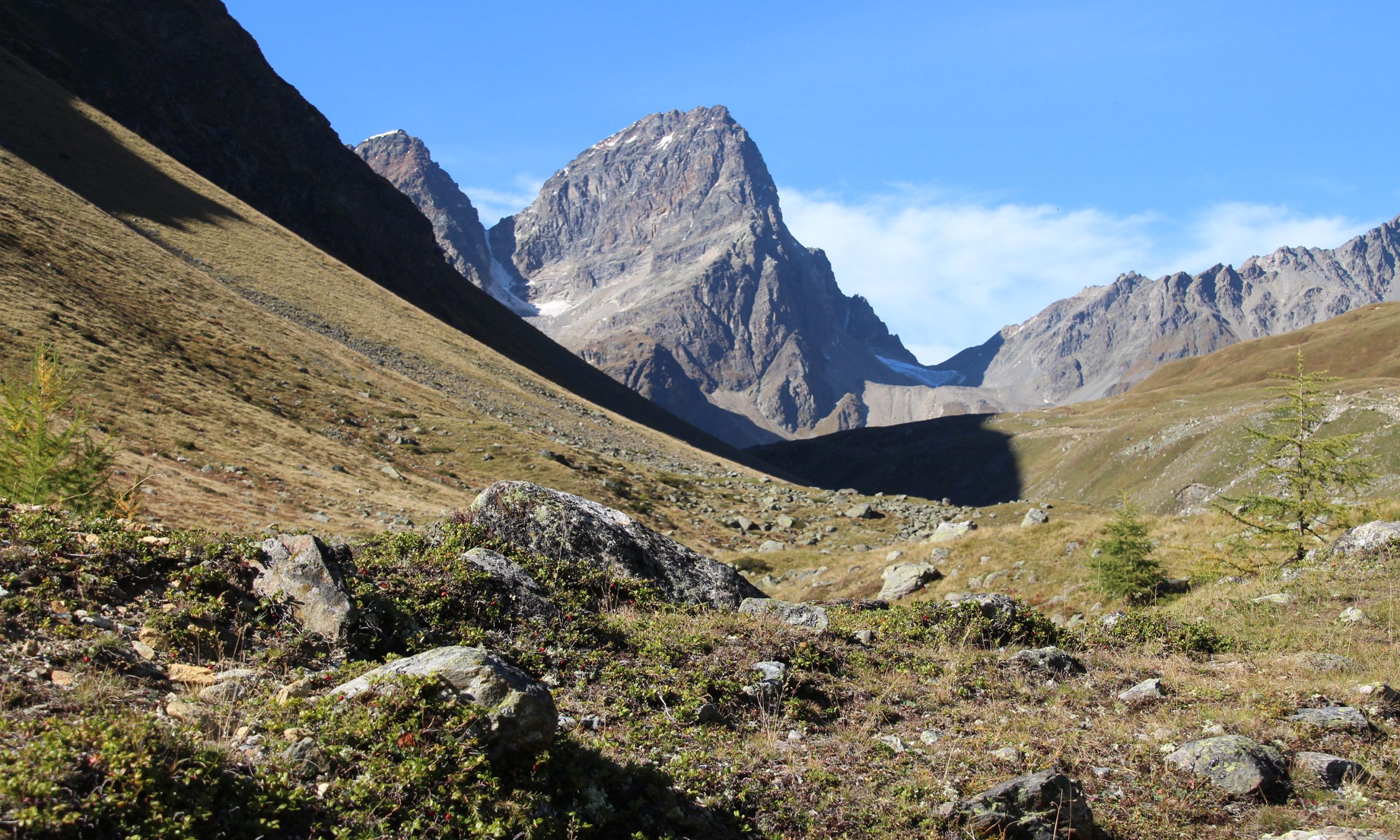 Rückblick zum urgewaltigen Piz Buin beim Abstieg durch das Val Tuoi nach Guarda.