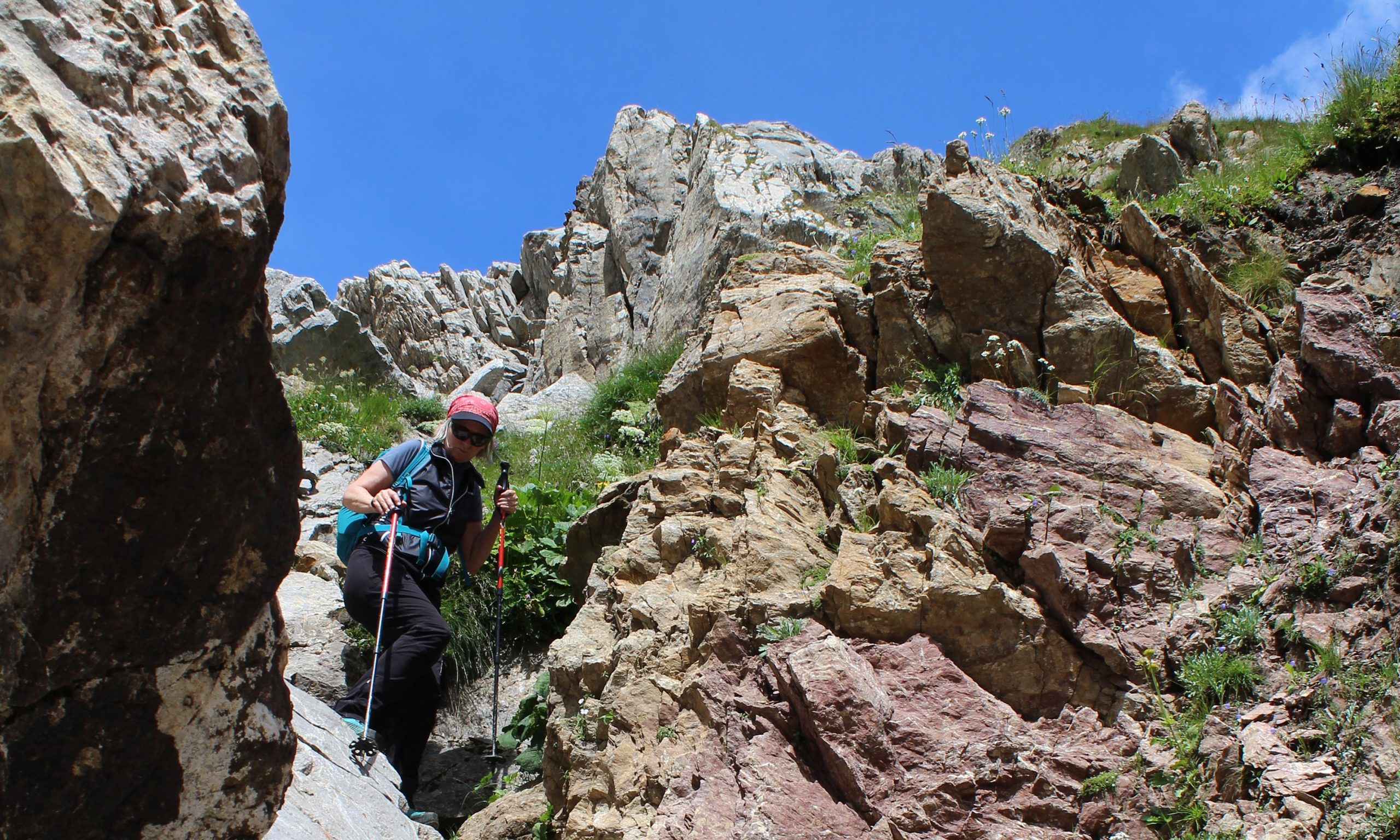 Beim Abstieg geht’s noch einmal durch sehr altes, rötlich gefärbtes Kalkgestein.