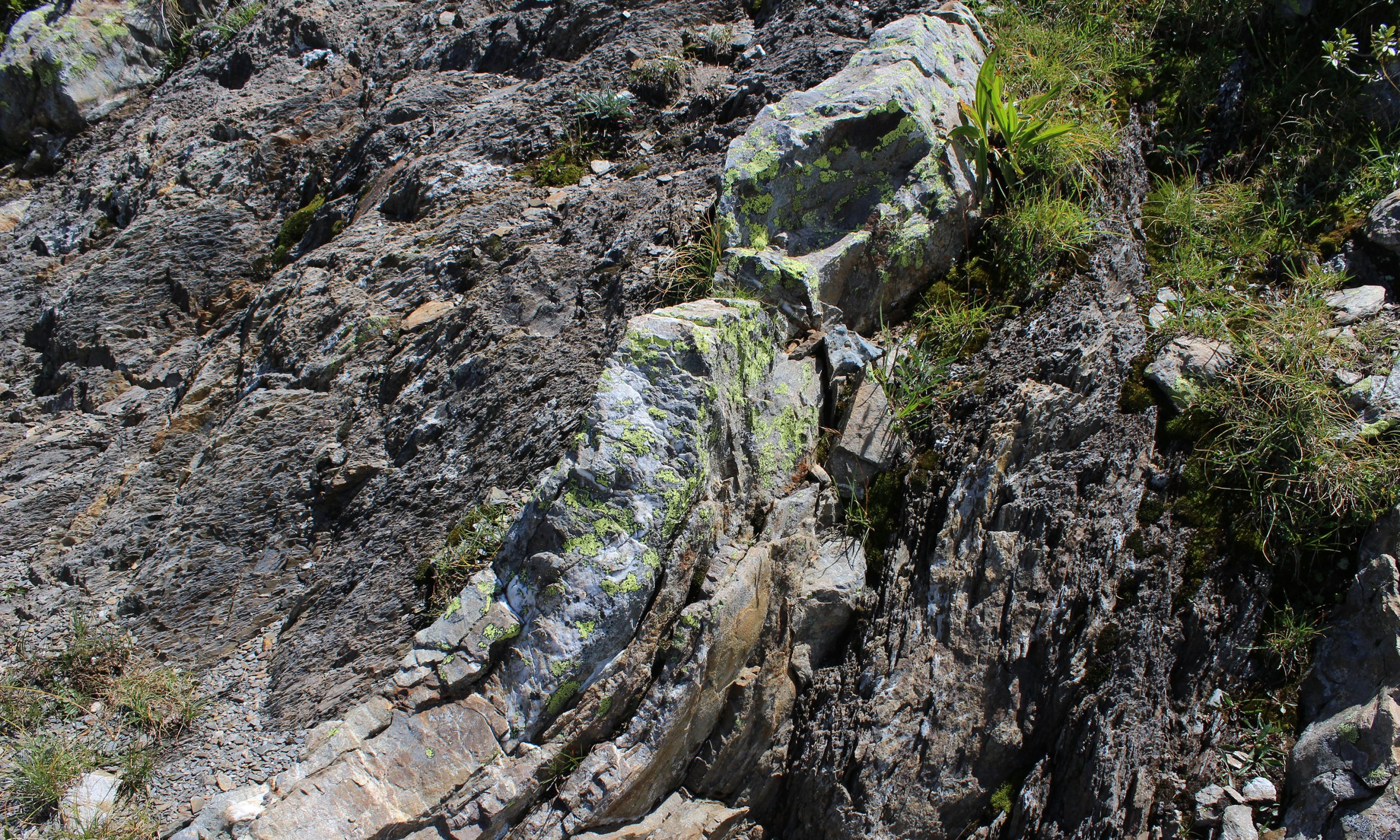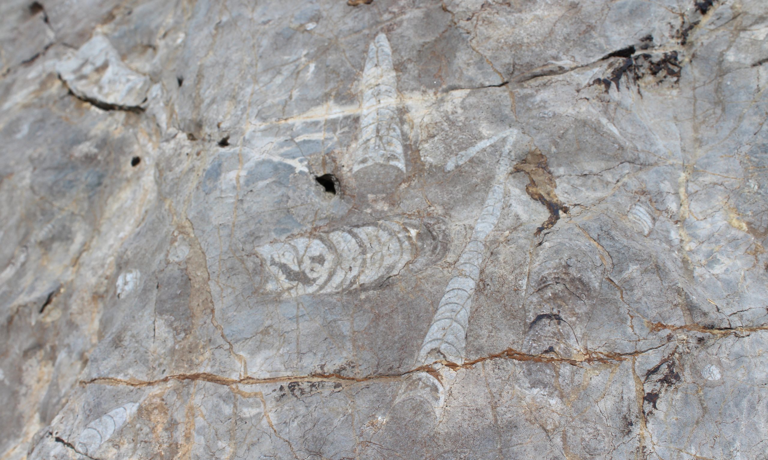 Besonders fasziniert ein Felsblock, der ein gutes Stück abseits des Geotrails aus einer Felswand gestürzt und auf ungefähr 2100 Metern Seehöhe liegen geblieben ist: Er erweist sich als ein wahrer Friedhof versteinerter Orthoceren. Auf dem grauen Gestein sind die Kammern ihrer spitzkegeligen, an Schultüten oder Zauberhüte erinnernden Schalen, die (anderswo) Längen bis zu neun Meter erreichten, gut zu erkennen. Diese Kopffüßler, längst ausgestorbene Verwandte der Tintenfische, lebten in der größten dieser Kammern, die mit Stickstoff gefüllt war, und konnten durch den Gasaustausch dazwischen per Rückstoß schwimmen, absinken, aufsteigen oder einfach nur dahinschweben.