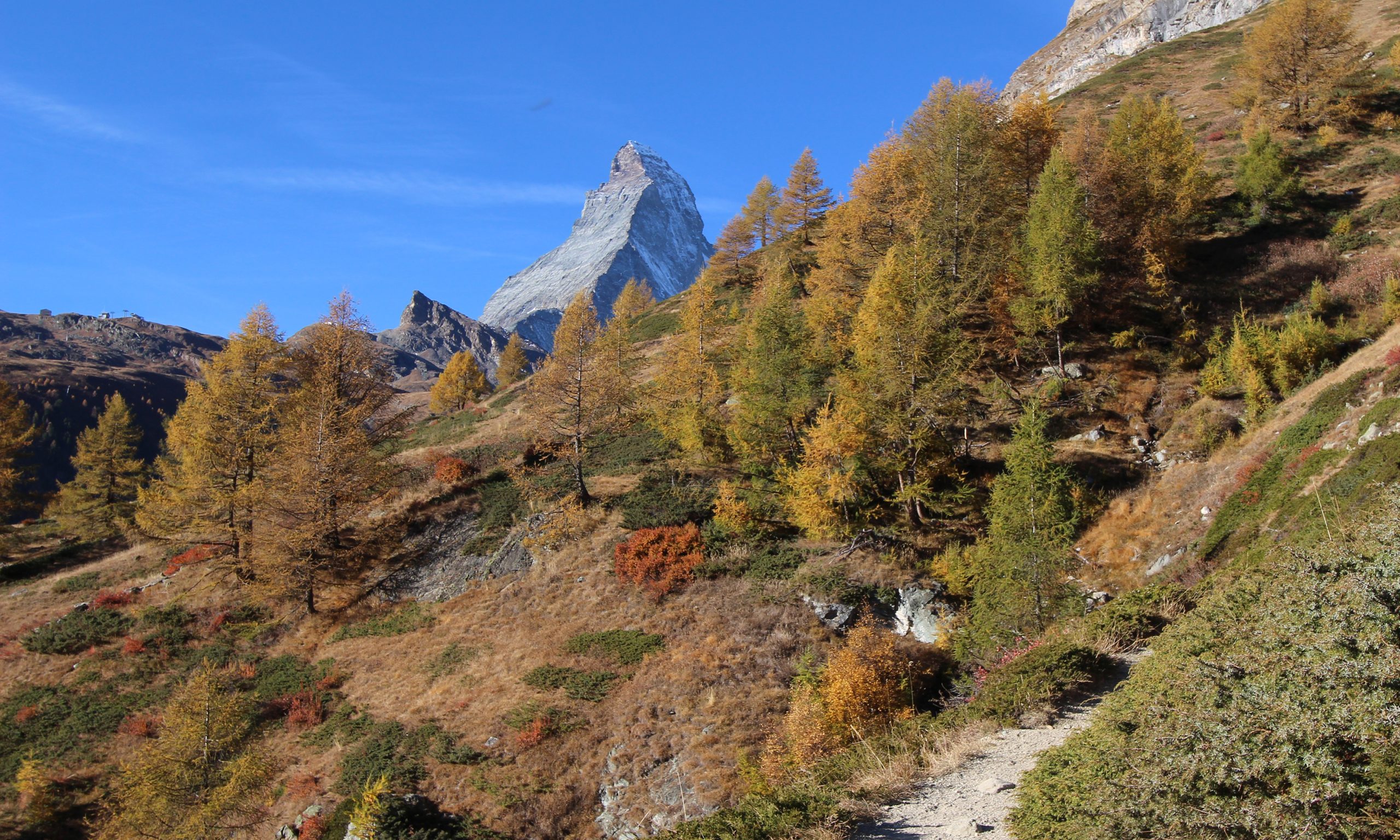 Rechts geht’s dagegen Richtung „Zermatt Kirche“ hinunter, wobei man einen Abstecher zum grossen Kreuz oberhalb des Ortes einlegen sollte. Vorbei am Hotel The Omnia kommen wir zur Bodmenstraße, an der die neugotische Englische Kirche an Charles Hudson und Douglas Robert Hadow, zwei weitere verunglückte Matterhorn-Erstersteiger, erinnert. Im nahen Ortszentrum von Zermatt gelangen wir links zum Bahnhof. 1:30 h.