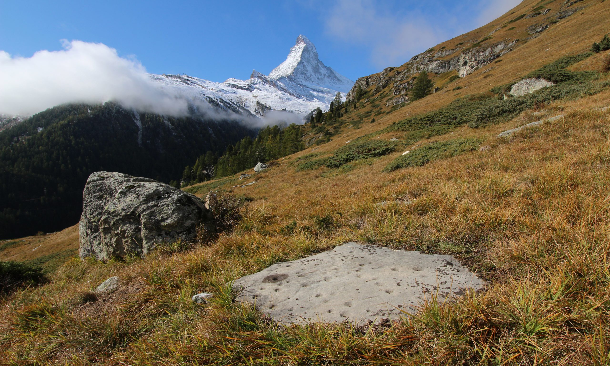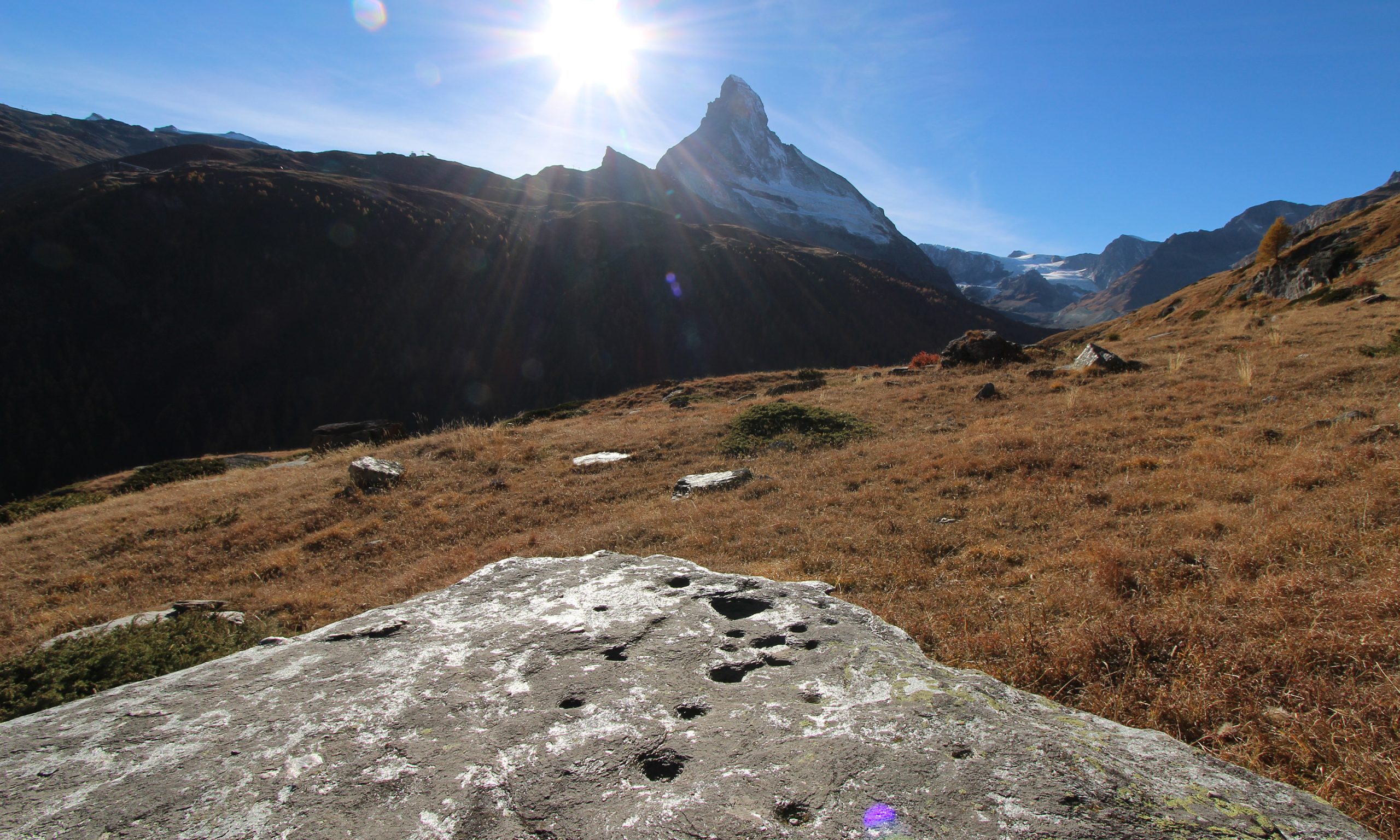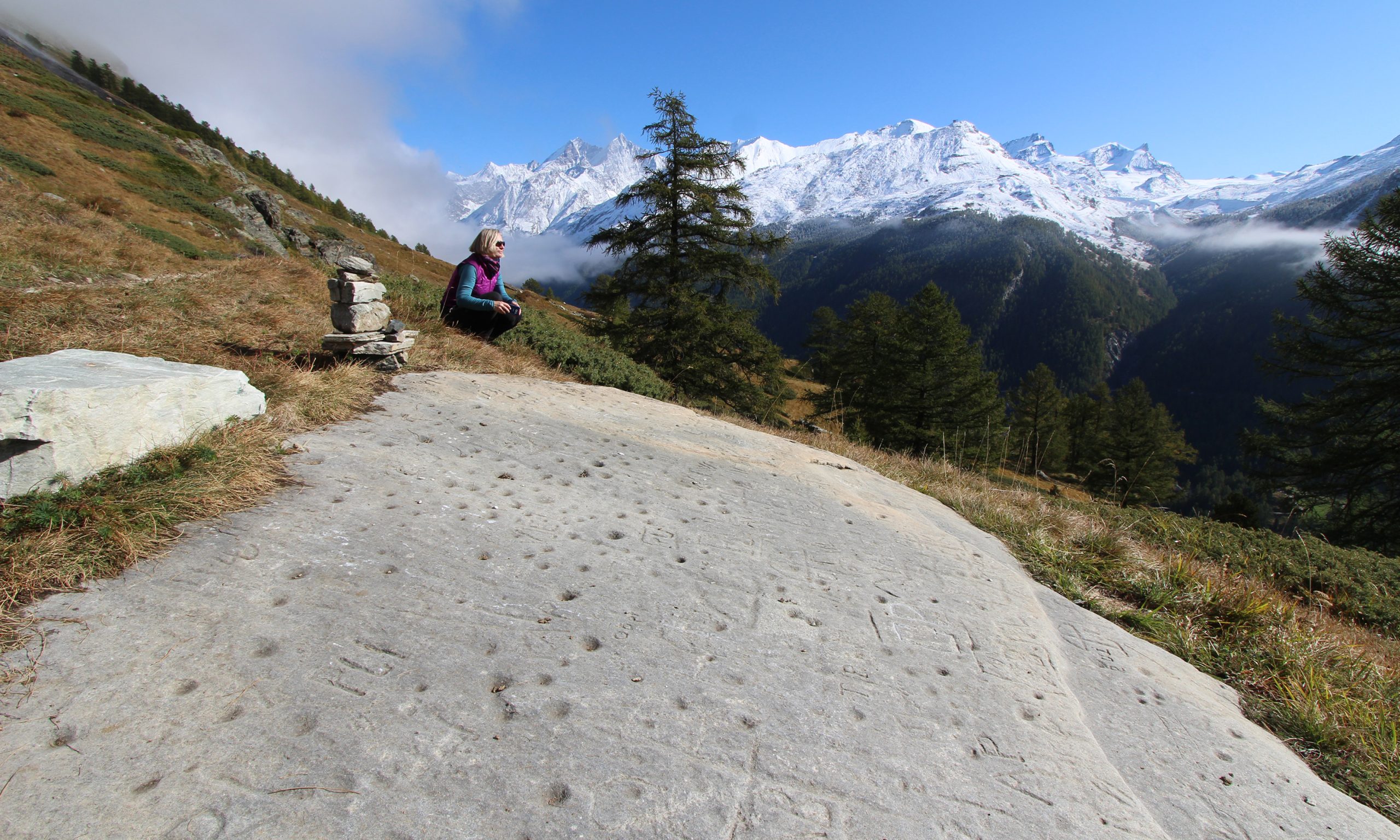Elf kleinere und größere Schalensteine verbergen sich im Nordwesten des Tourismus-Hotspots Zermatt – geradezu magische Plätze in bester Logenlage gegenüber von Mischabel und Matterhorn.