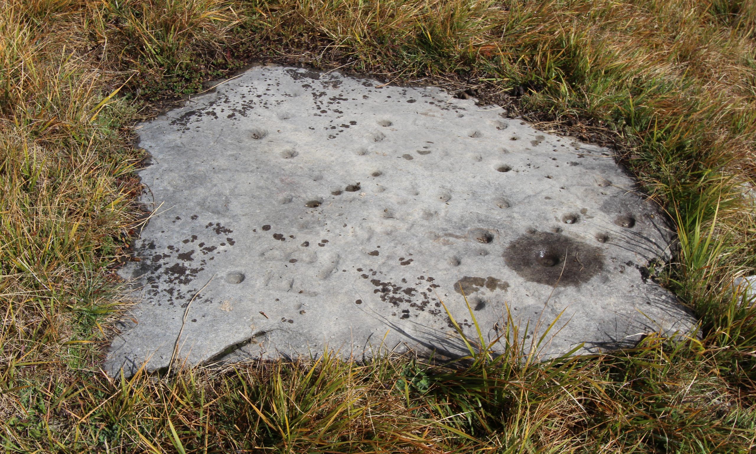 Von dort führt der Pfad weiter durch die Hänge der Hubelwäng und bald abwärts zu einer Abzweigung (2001 m). Von dort lohnt sich der Abstecher scharf rechts hinab zu weiteren, etwa 200 m entfernten Schalensteinen.