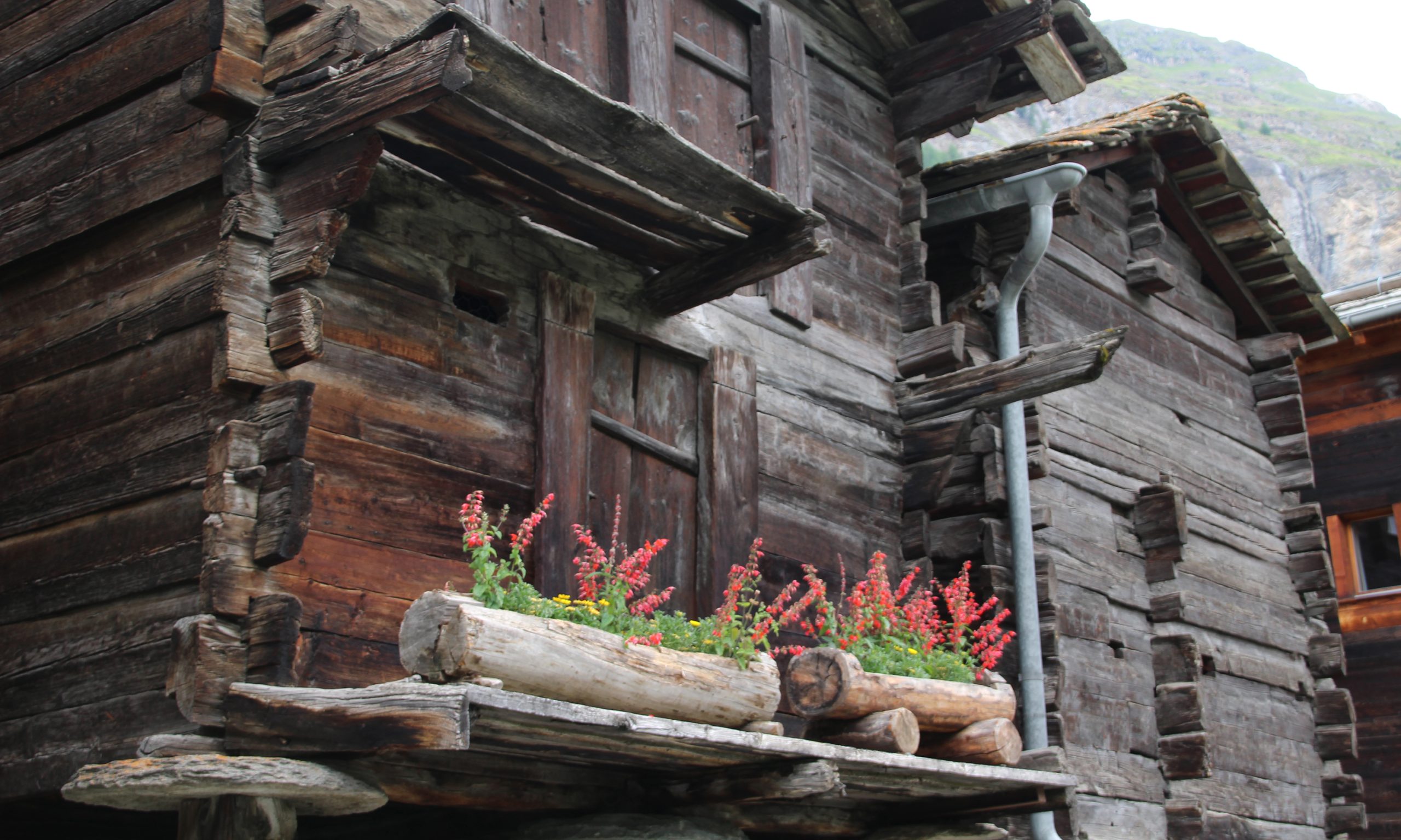 Wir durchqueren den 200 m langen und wildromantischen Felsschlund auf soliden Stegen und Treppen. Von einer Gabelung auf 1710 m folgen wir dann der Beschilderung „Blatten, Zmutt“ nach rechts. Durch steile Waldhänge kommen wir im Auf und Ab zu einer Brücke und jenseits – die Seilbahn unterquerend – in den Weiler Blatten (1738 m) hinauf. 30 Minuten.