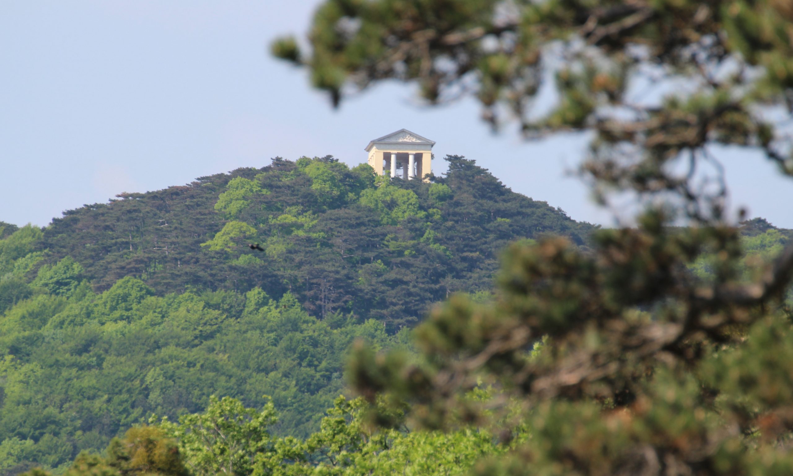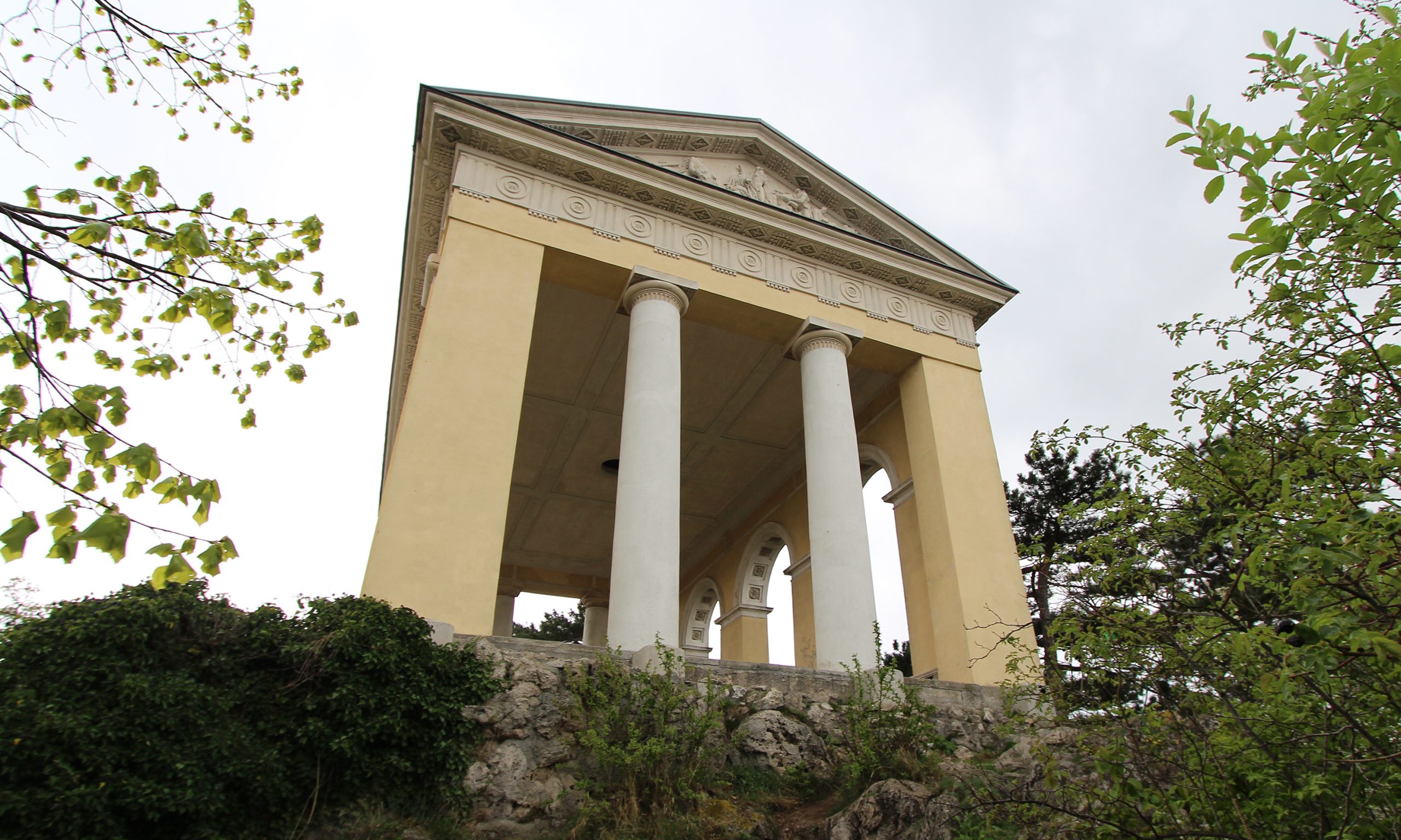 Links gehen wir wieder zurück zum breiteren Schotterweg, dem wir nun nach rechts folgen. Nach 60 m bleiben wir geradeaus Richtung „Hinterbrühl über Husarentempel“, wandern bald kurz ein wenig bergab und folgen dann stets der grünen Markierung weiter aufwärts. Nach einem Rastplatz zweigen wir rechts zum nahen Husarentempel (496 m) ab. 1:10 h